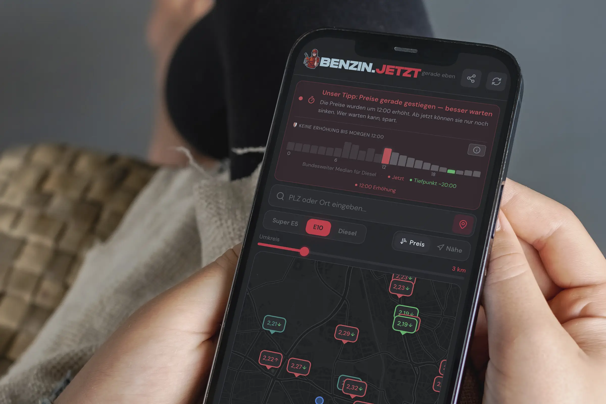 Nach 12 Uhr: Die Preise sind gestiegen. Die App empfiehlt zu warten — sie fallen im Tagesverlauf wieder.Analyse und Transparenz