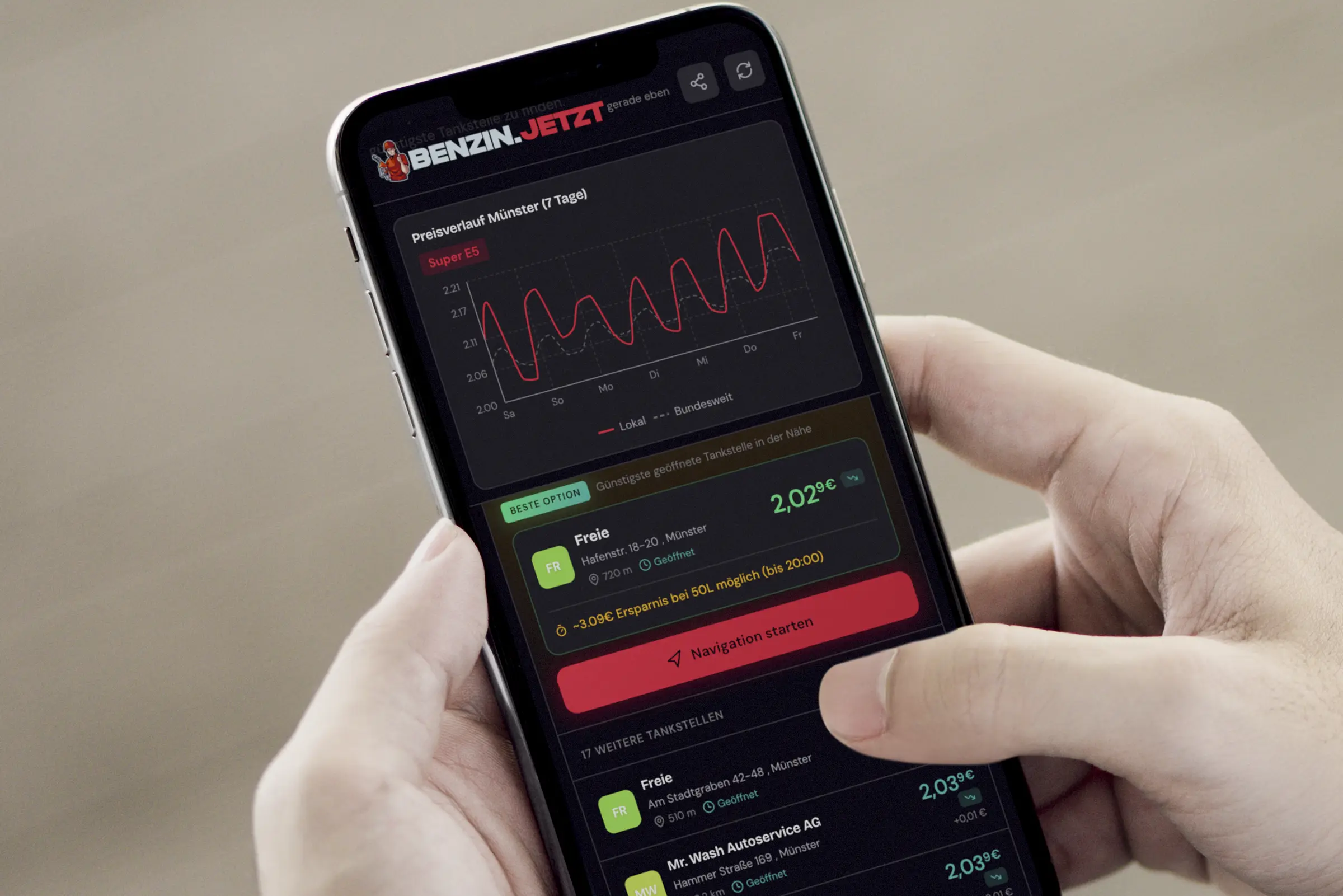 Zusätzlich zeigt benzin.jetzt die günstigsten Tankstellen in der Nähe, inklusive aktueller Preisentwicklung und direkter Navigation. Das Ziel: Weniger suchen. Weniger nachdenken. Besser entscheiden.